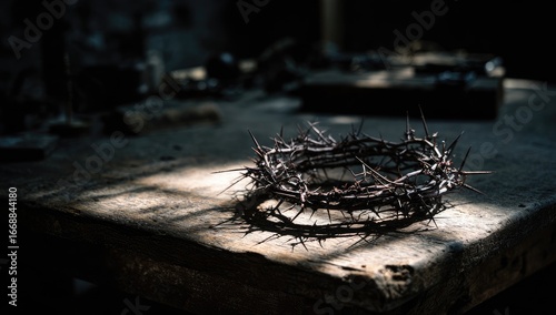 crown, thorn, crucifix, religious, dark, weathered, wood, table, workshop, light, shadow, holy, suffering, sacrifice, jesus christ, christianity, faith, pain, martyrdom, despair, hope, ancient, antique, sombre, grim, dusty, rustic, devotion, spiritual, darkness, symbol, hand-made, mediaeval, sacred, history, tradition, symbolism, still, object, detail