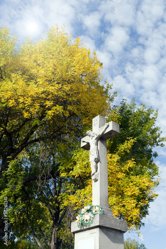Crucifix in the background of trees in autumn.