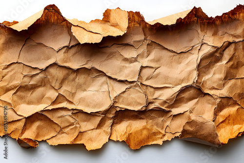 Crumpled brown paper with uneven edges sits on a flat surface during bright light