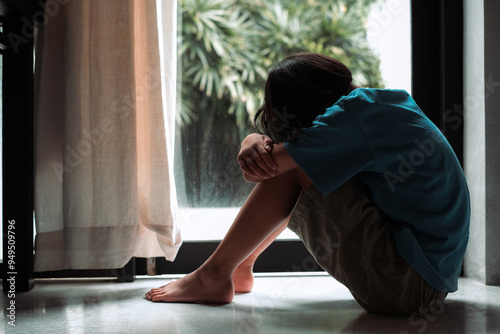 Crying girl, victim of bullying, abuse, violence, depressed patient, offering psychotherapy sitting on floor near door in the room. She was bullied, unhappy, upset, feel sick. Lonely concept.