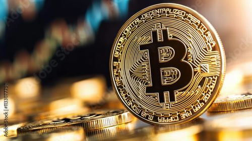 Cryptocurrency Financial Regulation. Bitcoin cryptocurrency coin with digital trading background.