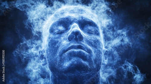 man, face, head, blue, smoke, fire, energy, digital, art, abstract, fantasy, mystical, serene, calm, peaceful, tranquil, dreamlike, enigmatic, spiritual, soul, mind, consciousness, imagination, thought, inner, peace, meditation, zen, spirituality, vapour, glow, light, dark, texture, graphic, design, illustration, creative, artistic, image, portrait, human