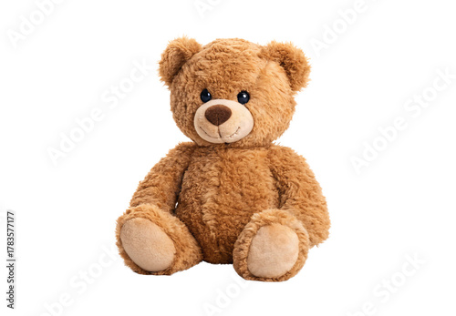 Cuddly caramel-colored stuffed bear with rounded ears, embroidered smile, classic toy design, front facing view, isolated on a transparent background