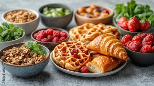 Culinary Delight: A visually stunning composition of diverse breakfast treats, artfully arranged to tantalize the senses, promising a delightful culinary journey.