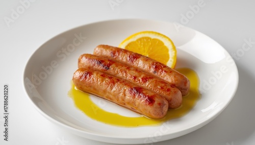 Culinary Still Life with Sausages and Citrus Slice on a Round Plate, Minimalist Presentation.