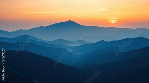 Cultural iconic Thailand, A serene sunset view over layered mountains, showcasing soft blue hues and an enchanting orange sky.
