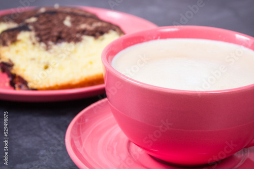 cake, pastry, dough, yeast, dessert, chocolate, cocoa, hot drink, caffeine, milk, cappuccino, drink, beverage, sweet, sugar, food, eating, calorie, snack, delicious, deliciously, baked, icing, ingredient, spice, aroma, aromatic, fresh, freshness, plate, cup, glasses, wooden, background
