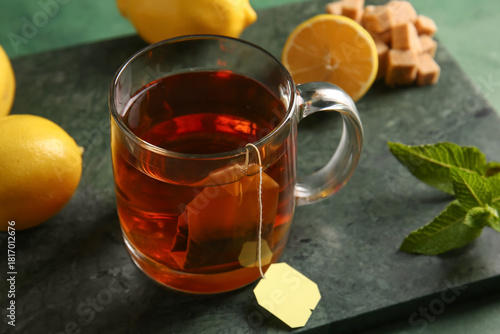 Cup of hot tea with lemons and mint leaves on green grunge background