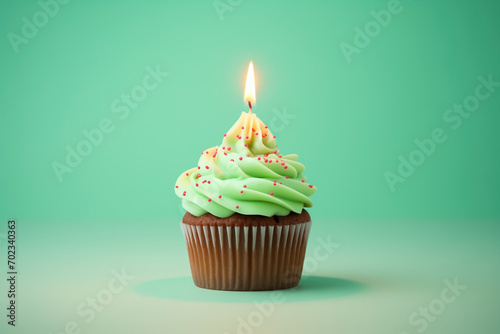 cupcake green cream with festive, burning candle, sprinkling, isolated, background