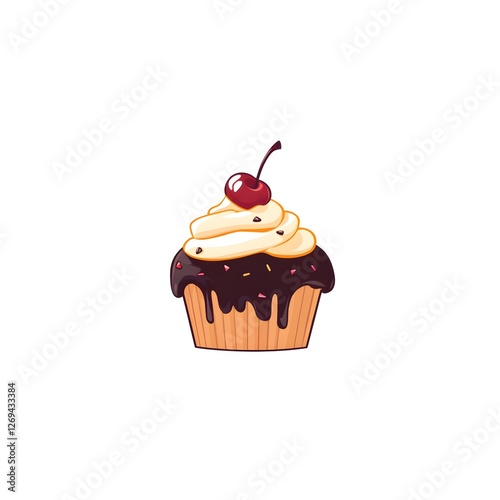 Cupcake with chocolate icing, whipped cream, and cherry on top displayed in a simplistic design