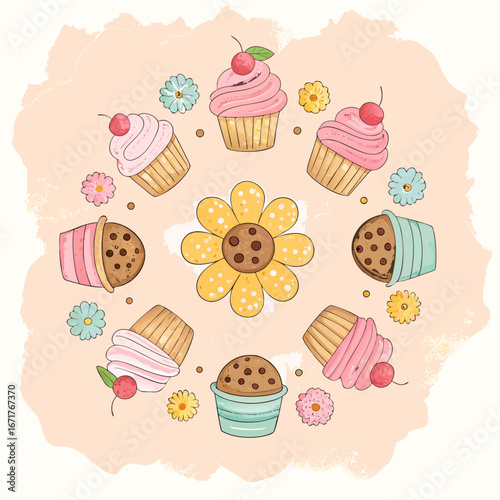 Cupcakes and Cookies Arranged in a Circle: Artistic Food Illustration