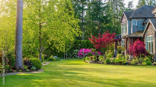 curb. Beautiful front yard with a healthy lawn and lush greenery in late spring. travel magazines, destination branding, designed for outdoor magazines and nature guides, used by health educators.