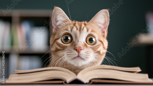cat, kitten, ginger, book, reading, education, curiosity, adorable, closeup, domestic, pet, animal, furry, eye, surprised, home, interior, green, sharpened, cute, felino, pet, content, study, fun, playful, joyful, expression, background, soft, bookshelf, literature, engagement, personality, learning, home decor, daytime, theme, studying, observation, illustrating, environment, indoor, lifestyle