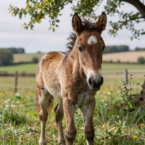 Curious wild foal approaches the camera, its mane ruffling on a green meadow