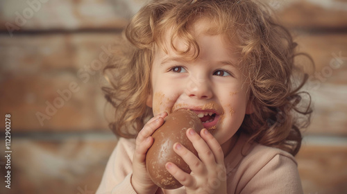 Curly-haired boy happily eating a large chocolate Easter egg.