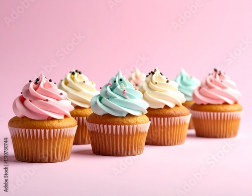 Custom AI Model - Decorated muffin cakes in a row with sprinkles on a pink background