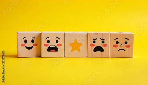 Customer Reviews Concept – Wooden Blocks with Faces & Star Ratings, Review, Rating Satisfaction concept, Customer Experience Concept, Concept of excellence, Five stars, created with generative ai
