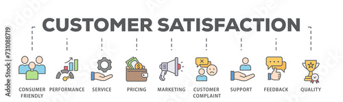 Customer satisfaction banner web icon illustration concept with icon of consumer-friendly, performance, service, pricing, marketing, customer complaint, support, feedback and quality