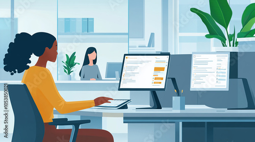 Customer support specialist resolving client inquiries using chat software in a modern tech office.