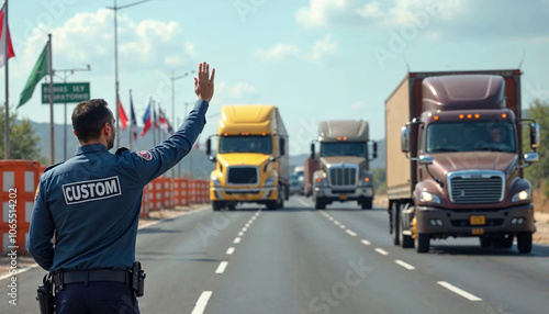 custom, officer, border, checkpoint, commerce, control, uniform, badge, halt, tension, driver, patience, concern, barrier, signage, regulation, flag, nation, international, trade, security, role, critical, global, challenge, authority, enforcement, procedure, vigilance, protocol, entry, import, export, restriction, inspection, compliance, police, construction, traffic, street, safety, station, road, highway, car, transportation