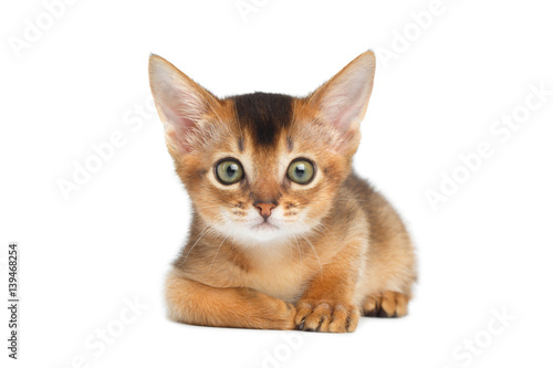 Cute Abyssinian Kitty Lying on Isolated White Background, front view