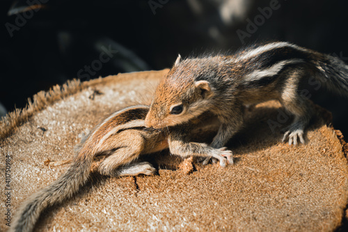 Cute and orphan squirrel baby siblings wander on top of a cut-down tree trunk. Caring and looking after the small brother, the concept of the family stays together no matter what. close up mammals.