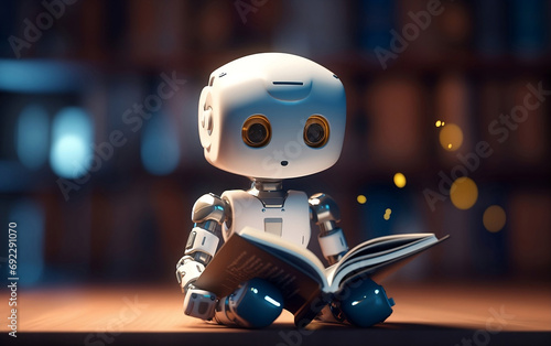 Cute android robot reads the book in the dark library