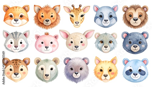 animal, face, cute, watercolor, illustration, cartoon, children, drawing, children, design, digital artwork, wildlife, illustration, portrait, adorable, set, graphic, clip art, poster, print, baby
