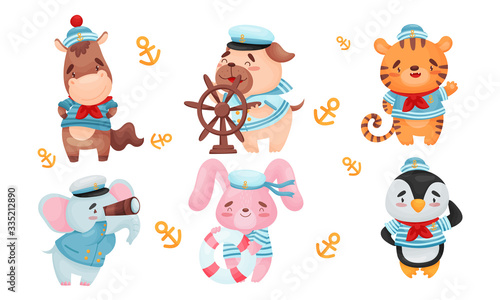 cute, animal, sailor, suit, hat, fishing, sailing, sea, cartoon, creature, enjoy, nautical, adventure, set, funny, striped, vest, character, horse, elephant, hare, penguin, tiger, dog, illustration, children, marin, ocean, seafaring, smile, captain, childhood, clip art, crew, cruise, isolated, wildlife, transport, transportation, sailboat, playful, pet, comic, cheerful, boat, mammal, wheel, uniform, joyful, vector