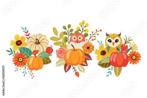 autumn, fall, owl, pumpkin, floral, flower, harvest, season, decoration, illustration, cute, design, nature, leaf, botanical, garden, ornament, celebration, seasonal, traditional, symbol, countryside, organic, vegetable, gourd, sunflower, rose, chrysanthemum, foliage, tree branch, berry, red, orange, yellow, white, green, isolated, background, clip art, graphic, vector