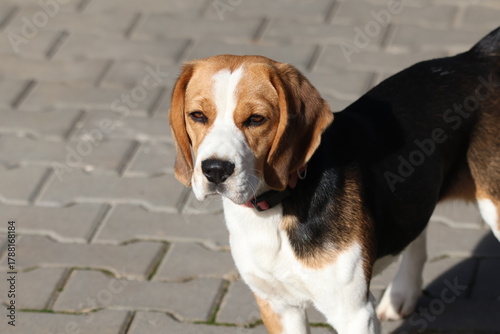 Cute beagle puppy portrait on a grey background. Beagle dog standing on pavement with eyes closed in sunlight, relaxed pet enjoying warm day outdoors