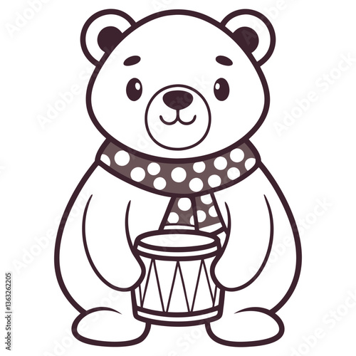 bear, cartoon, foulard, pois, drum, animal, outline, character, toy, line art, pet, funny, childish, mascot, fairy tale, clip art, decoration, symbol, cheerful, music, musical instrument, adorable, sweet, smile, kind, play