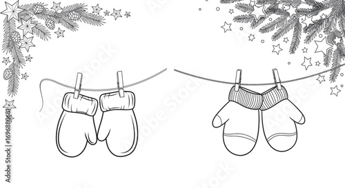 Cute Black and White Line Art of Winter Mittens Hanging on a Clothesline with Festive Decorations