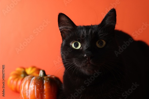 Cute black cat and pumpkins on orange background, closeup. Adorable pet