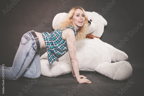cute blonde teen in jeans and plaid shirt plays with her huge Teddy polar bear in yellow scarf on black background alone