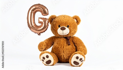 Cute brown teddy bear with balloon letter G. Baby name reveal after child birth. Stuffed animal isolated on white background