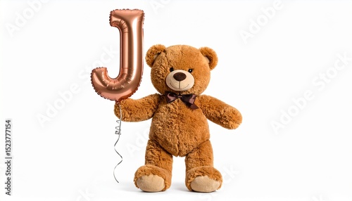 Cute brown teddy bear with balloon letter J. Baby name reveal after child birth. Stuffed animal isolated on white background