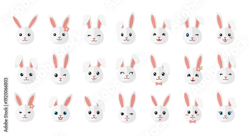 Cute Bunny Faces Collection, Various Emotions and Expressions, Vector Illustration