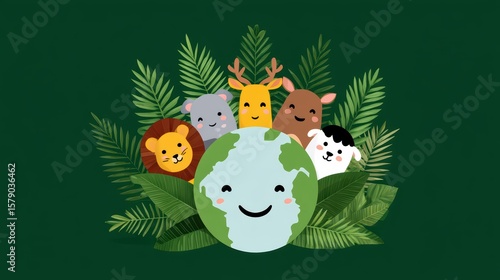 Cute Cartoon Animals Surrounding a Smiling Earth with Green Leaves on a Solid Background