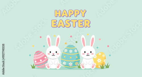 Cute cartoon bunnies and colorful easter eggs with 'happy easter' text in a cheerful pastel design.