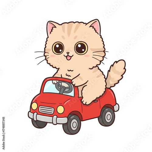 cat, kitten, felino, animal, pet, cute, adorable, fluffy, cartoon, car, art, illustration, drawing, character, toy, vehicle, red, driving, steering, wheel, wheel, tire, headlamp, grille, windscreen, passenger, playful, happy, smiling, joy, fun, glee, delight, amusement, entertainment, childish, innocence, youth, small, tiny, miniature, children, children, simple, graphic, vector, white, background