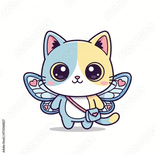 Cute cartoon cat with blue and yellow fur big eyes and delicate butterfly wings carrying a pink heart bag Isolated