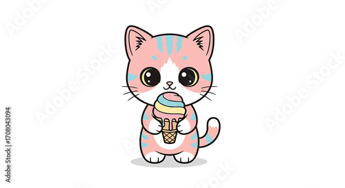 Cute cartoon kitten with pink and blue stripes holding an ice cream cone