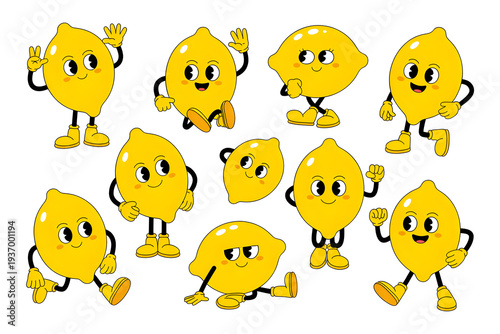Cute Cartoon Lemon Characters Pack — Playful Yellow Lemons with Faces, Arms and Legs in Multiple Poses on White Background Tags: