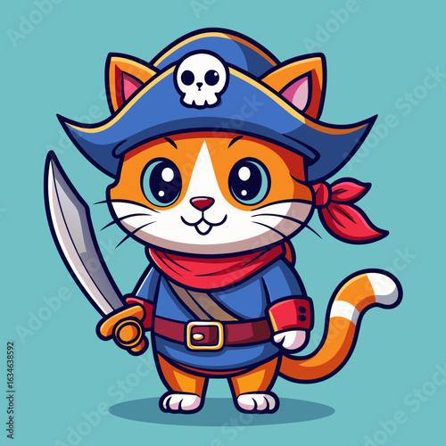 cat, pirate, cartoon, illustration, cute, animal, kitten, felino, pet, white cat, sword, cutlass, bandana, belt, costume, character, mascot, children, children, drawing, vector, clip art, adorable, playful, adventure, sea, ocean