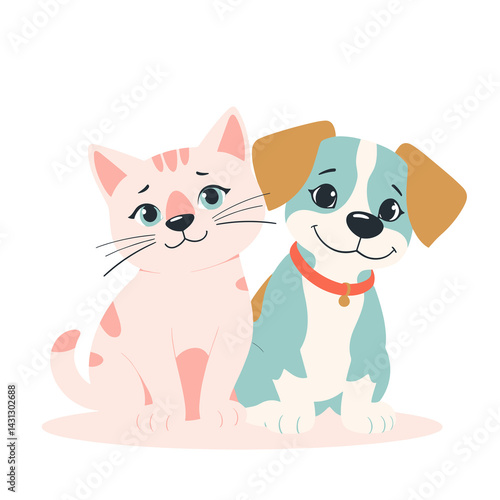 at, dog, pet, animal, cute, cartoon, character, kitten, puppy, friends, happy, smiling, domesticated, expression, companion, playful, colourful, illustration, drawing, friendship, fluffy, adorable, fun, furry, young, companionship, love, joy, isolated, joyful, casual attire, sunny, graphic design, studio, sitting, white background, copy space