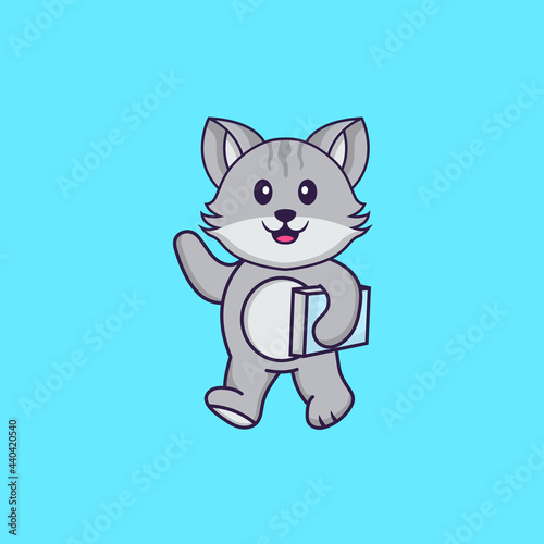Cute cat holding a book. Animal cartoon concept isolated. Can used for t-shirt, greeting card, invitation card or mascot. Flat Cartoon Style