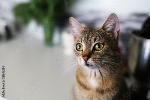 Cute cat sitting on the kitchen countertop and waiting for food, cat portrait