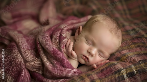 Cute Caucasian newborn infant baby girl asleep wrapped in a soft pink plaid. Adorable newborn baby girl portrait studio stock image