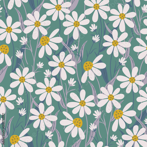 Cute daisy flowers and leaves print on green background. Floral seamless pattern. Chamomile meadow wildflowers. Hand drawn vector illustration for textile, wallpaper, wrapping paper.